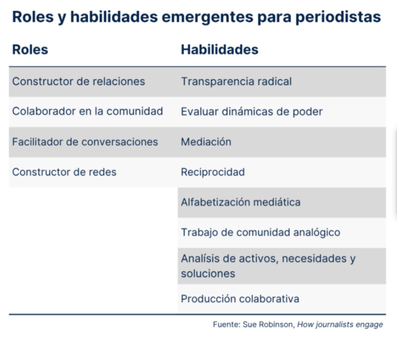 ¿A qué se parece un periodismo basado en el cuidado? Robinson estudió varios movimientos periodísticos en Estados Unidos que se alejan de las prácticas tradicionales, como el periodismo comunitario o ciudadano. Identificó un conjunto de valores y habilidades que las y los periodistas necesitan para responder adecuadamente a los “tipos afectivos de confianza” que la gente exige.
